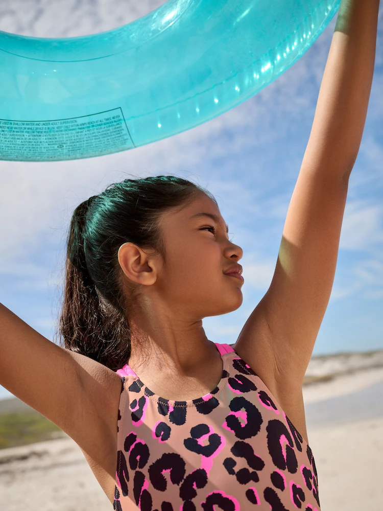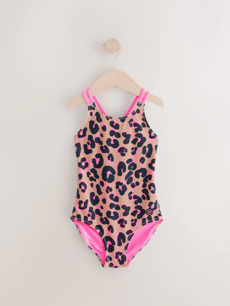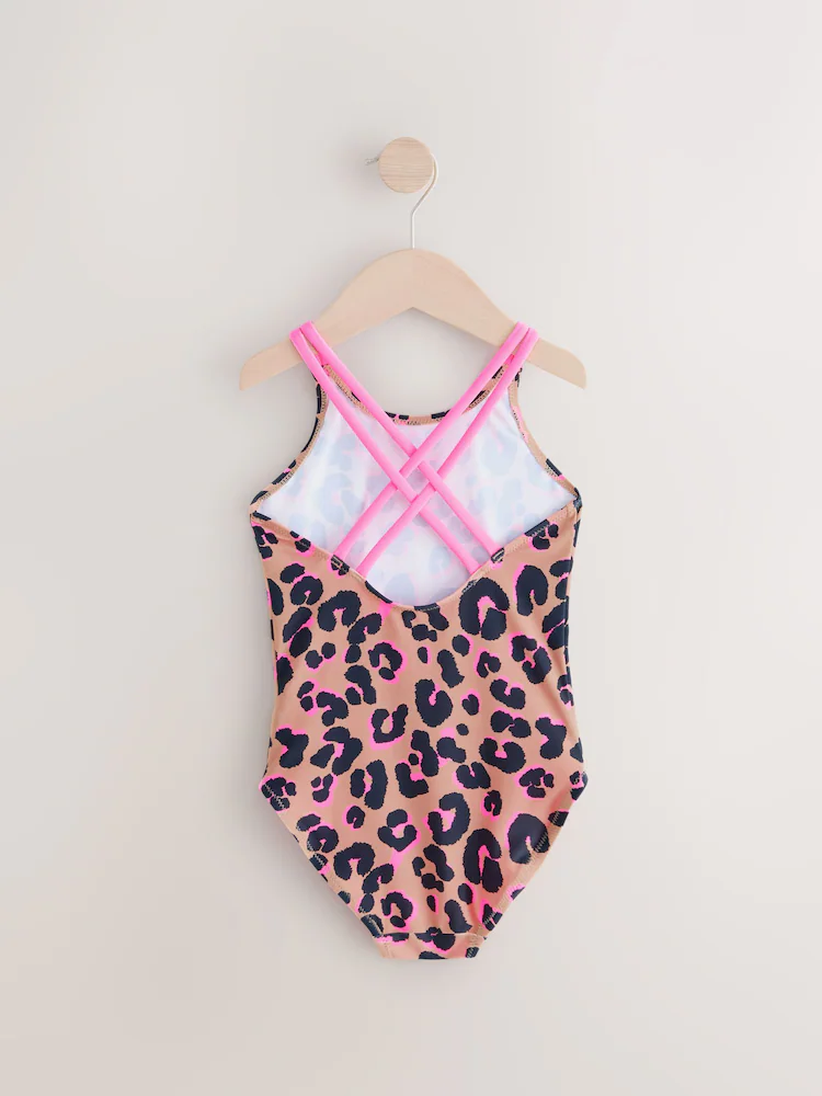 A must-have for swimming fans, this sporty animal print swimsuit features a double cross over back strap design for comfort and style. Perfect for the pool or beach, she’ll be making a stylish splash wherever she goes.This swimsuit includes LYCRA Xtra Life fibre technology which is designed to provide long-lasting fit retention through resistance to chlorine degradation.