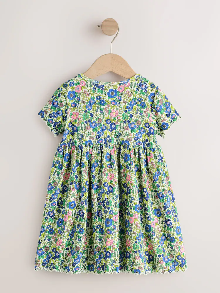 Blue Floral Short Sleeve Ribbed Dress (3mths-7yrs)