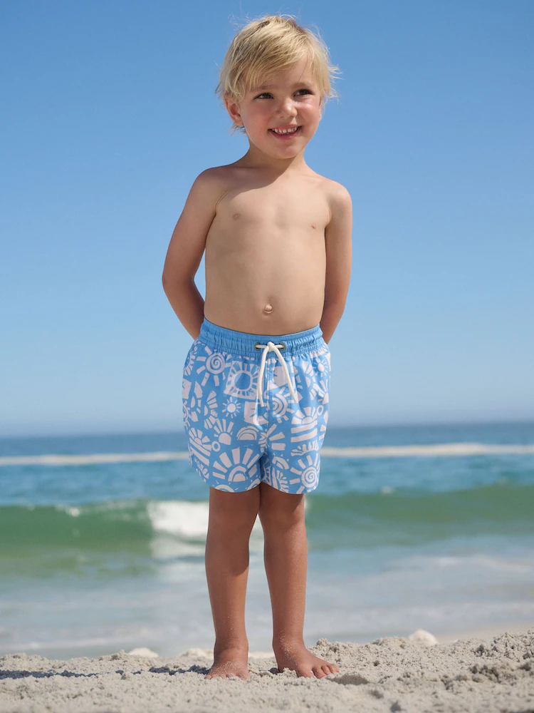 These Blue Printed Swim Shorts are a bright and practical choice for beach or poolside fun. Designed with a vibrant coastal-inspired pattern, they feature a functional drawcord to ensure a secure and adjustable fit for active play.