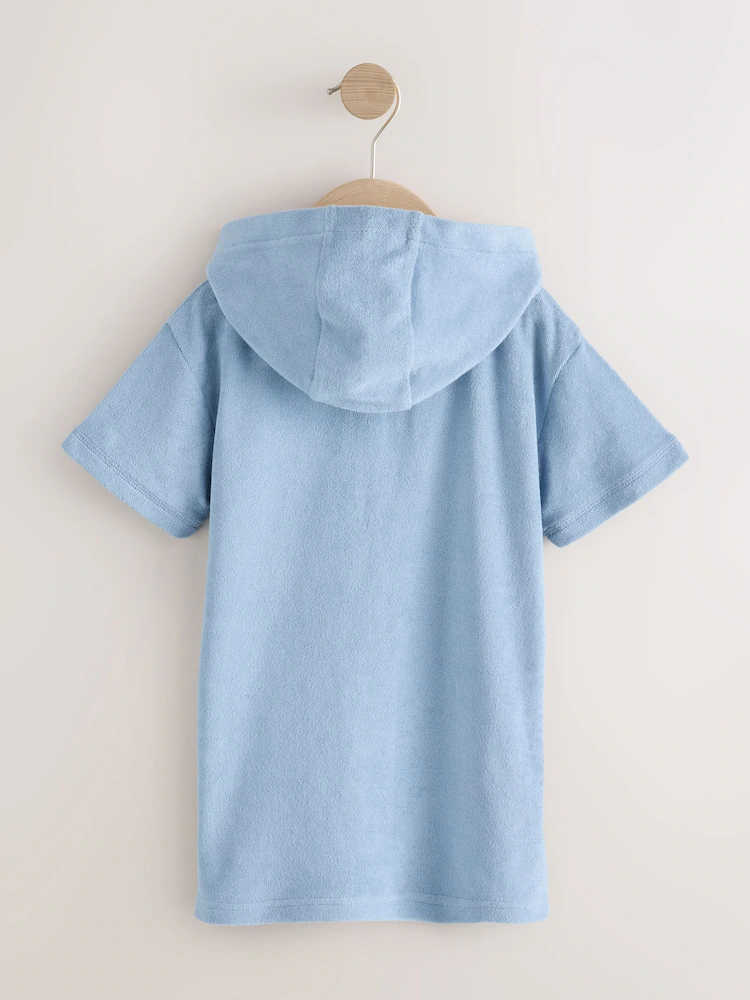 This cover-up is made from soft towelling fabric, designed for drying off after swimming. It features a functional zip-through front and a large hood.