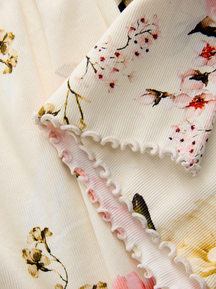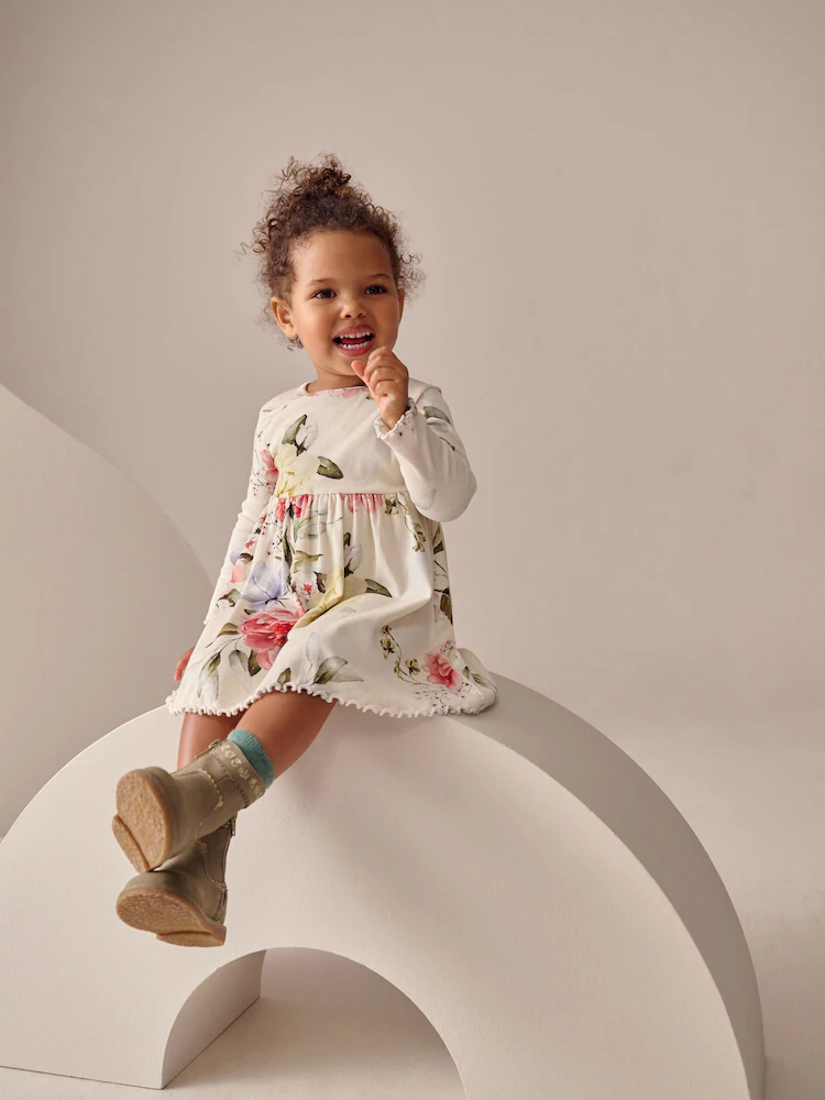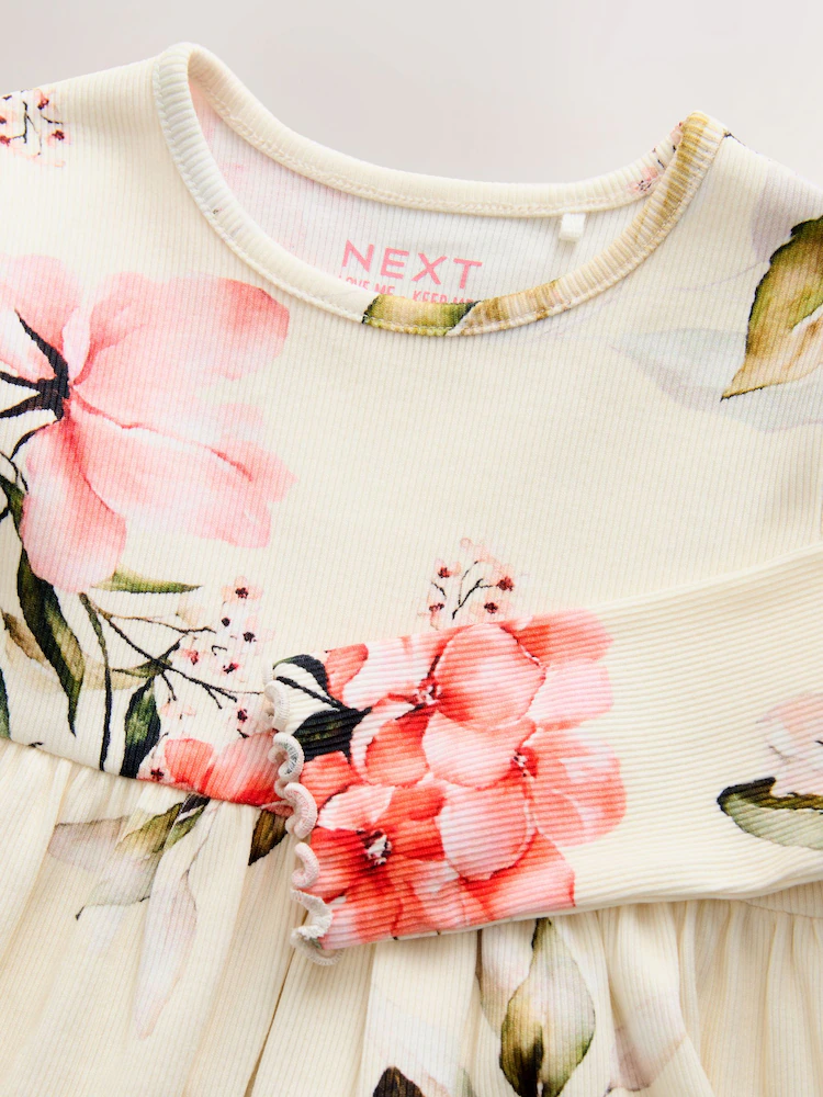 Cream Floral Long Sleeve Ribbed Dress (3mths-7yrs)