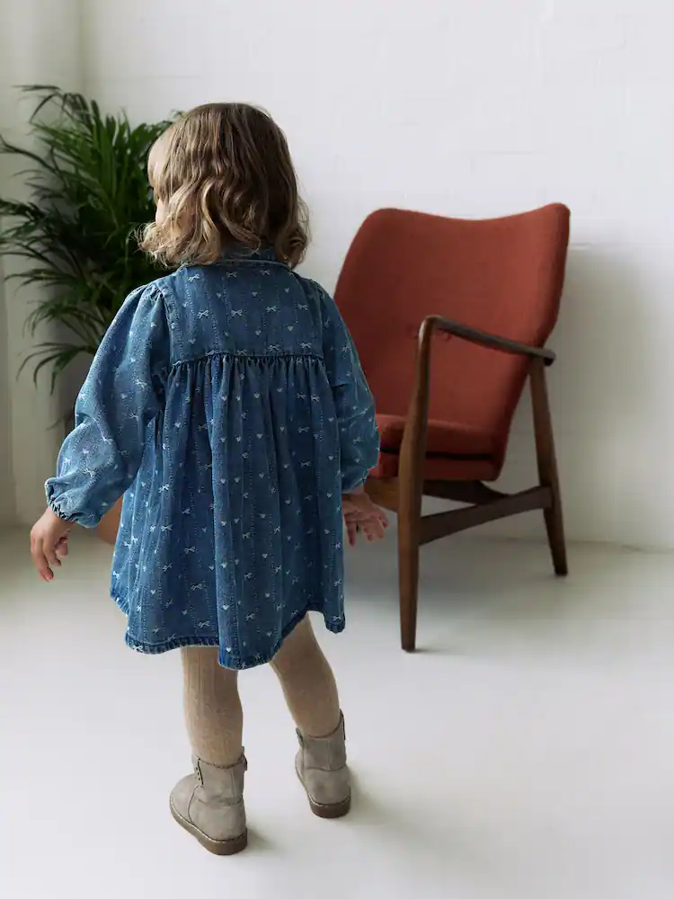 Our Denim Bow Long Sleeve Collar Dress is a timeless favourite. Made from soft cotton denim fabric with an all-over print of adorable bow motifs, this dress is comfortable for all-day wear. It features a sweet, contrast-stitched cute dolly collar and an easy half-placket of buttons at the front. The long sleeves are gathered at the cuffs, and the smock-style bodice gives way to a full skirt, creating a perfectly playful and classic look.