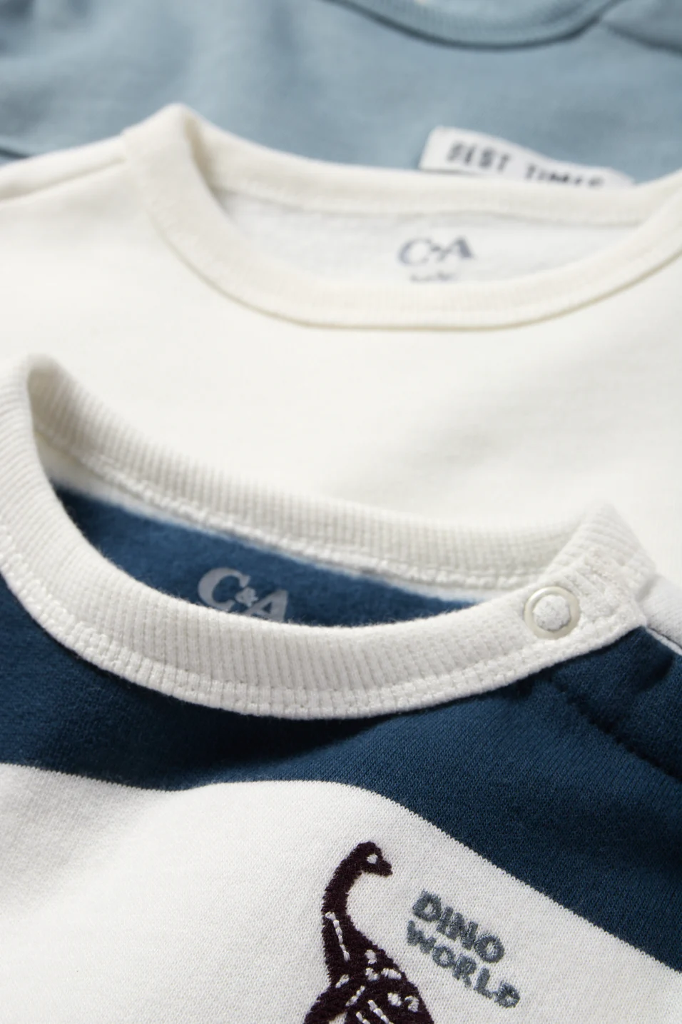 Baby sweatshirts in soft quality. Snap button on the side of the neckline and ribbed cuffs. One striped version with dino embroidery and two with structure parts, one of them with dino patch.