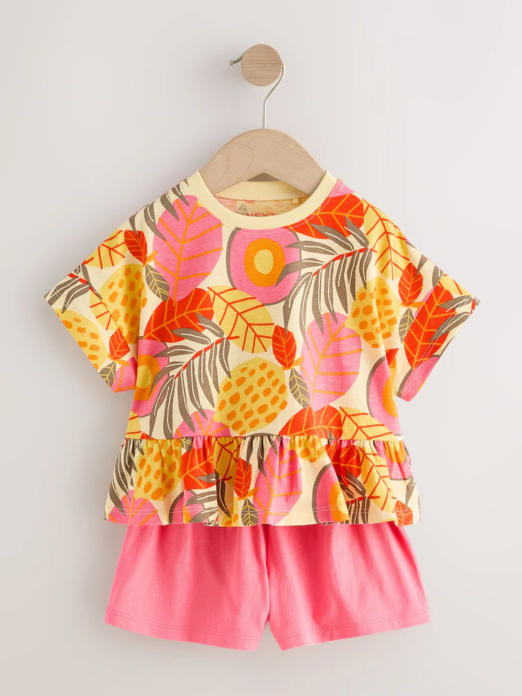 Bring a burst of tropical sunshine to their wardrobe with the Pink Flowers Short Sleeve Top and Shorts Set. This vibrant two-piece ensemble is designed for ultimate ease, making it a comfy summer set for all-day play and warm-weather adventures. The set features a relaxed t-shirt adorned with a bold, colourful tropical print of oversized leaves and bright abstract florals. The top is finished with a sweet peplum-style frill at the hem, perfectly complemented by a pair of solid pink shorts. With a flexible elasticated waist, these shorts offer a secure yet comfortable fit for active little ones.