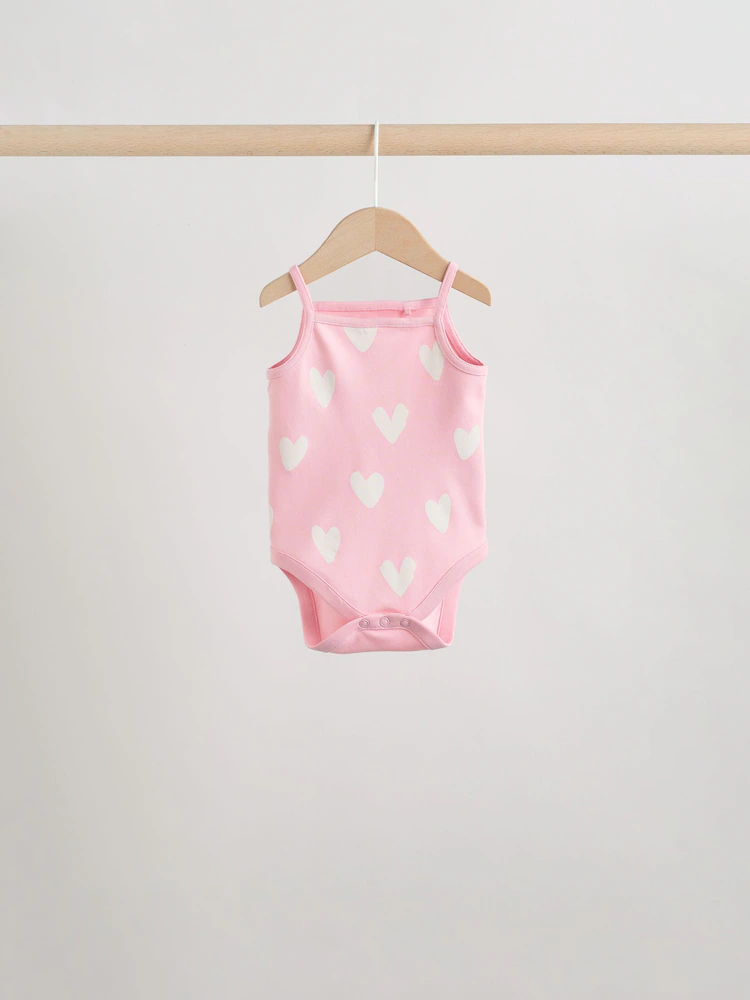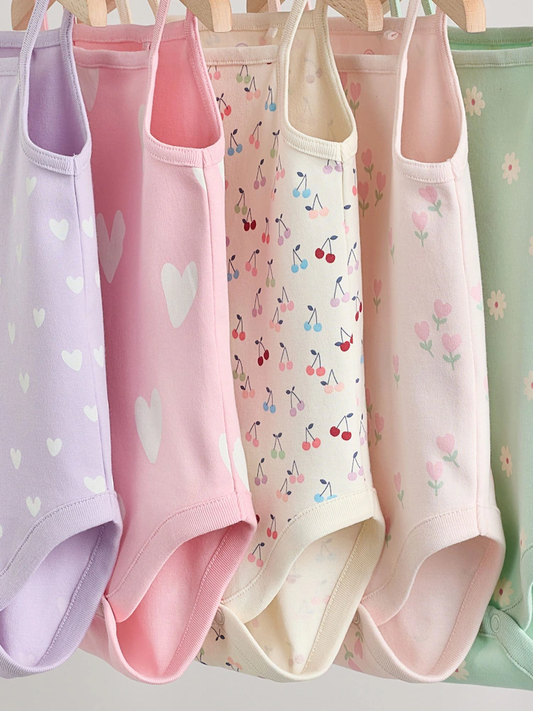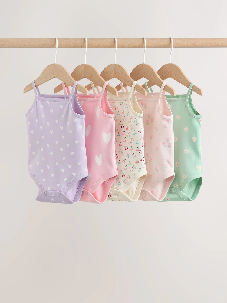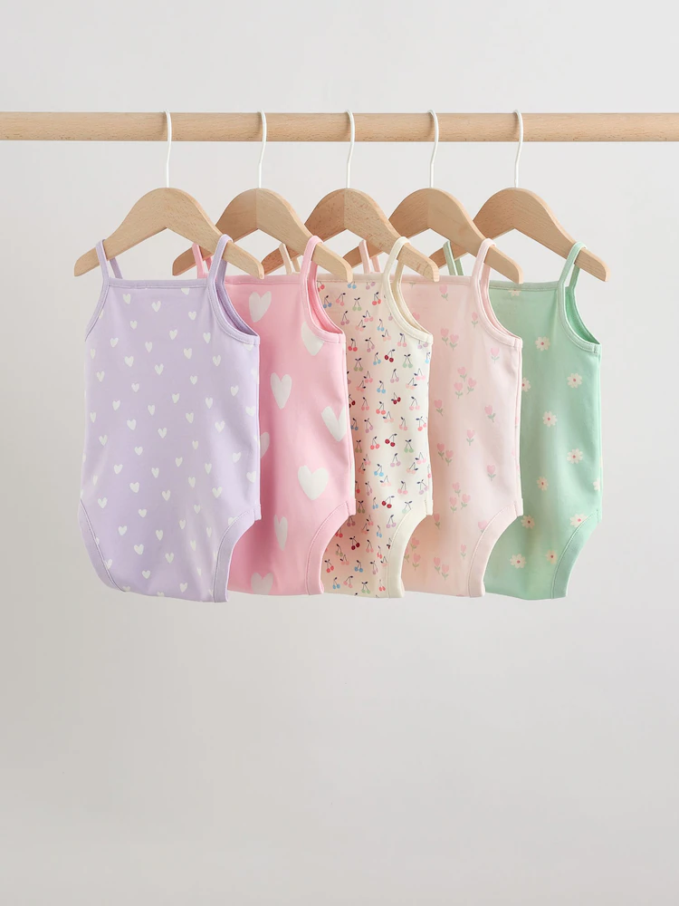 This five-pack of assorted pastel baby vests features a variety of charming prints, including hearts, cherries, and floral patterns in soft pastel shades. Crafted from super soft cotton, these bodysuits are designed for ultimate comfort and easy daily wear.